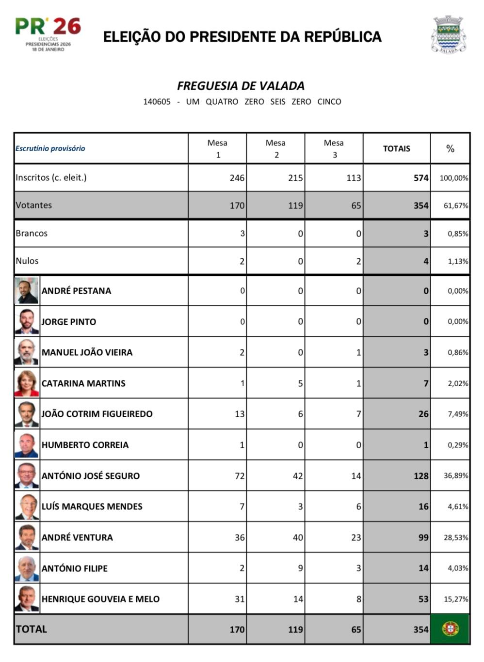 De acordo com o apuramento efetuado, os resultados obtidos na Freguesia de Valada foram os seguintes: